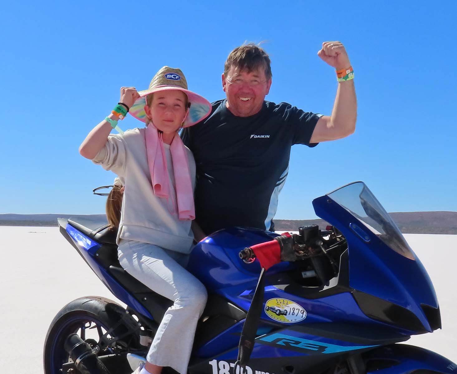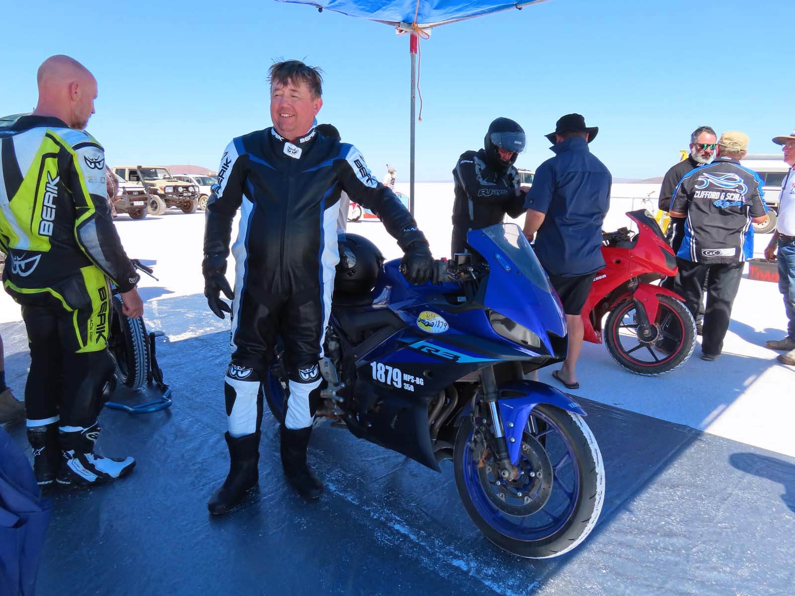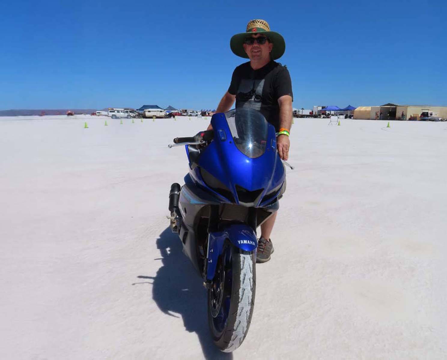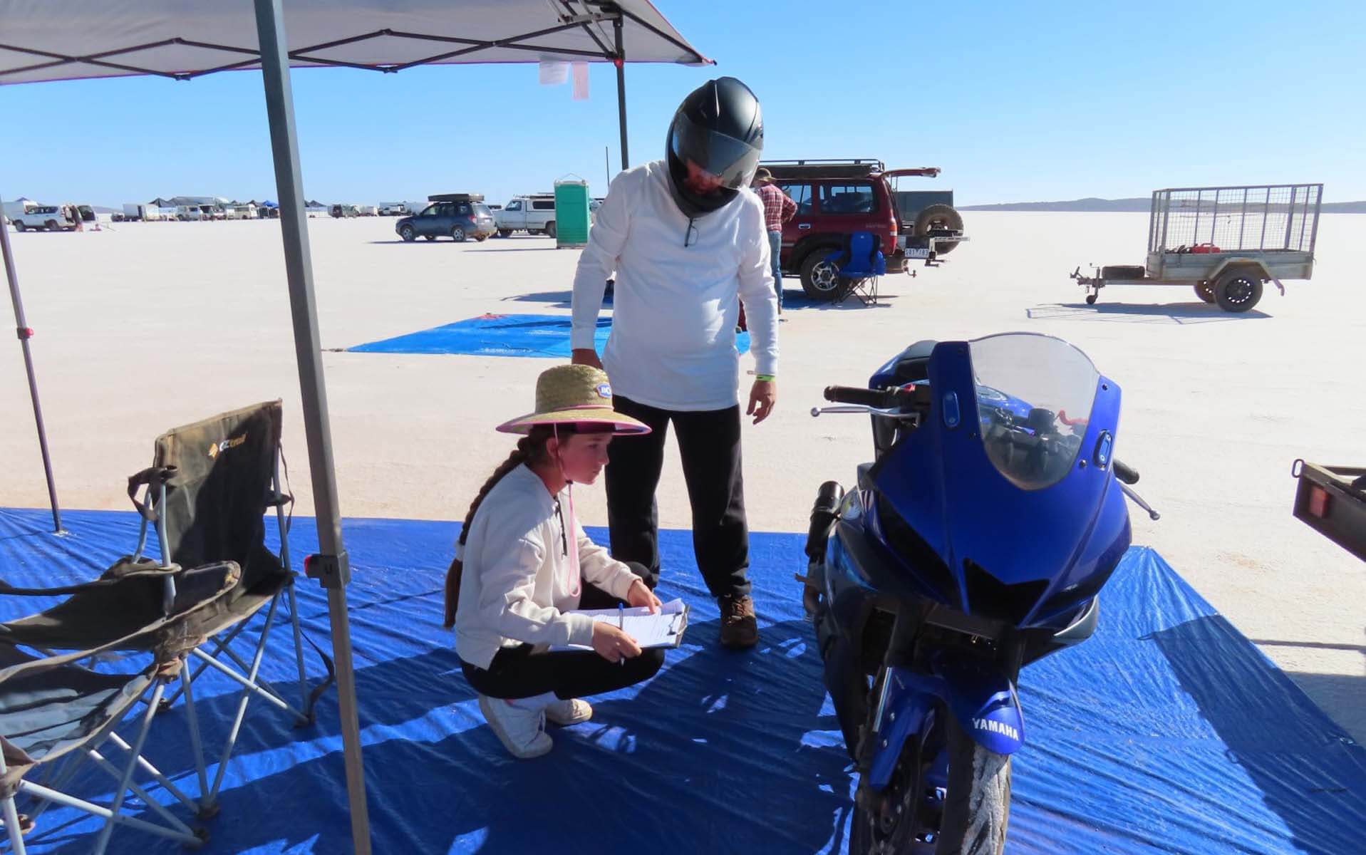 The week flew by! (Pun intended) The conditions were intense, with temperatures nearing 40°C each day, but my team—Nell (my wife) and Sarah (my daughter)—worked tirelessly to bring this project to the finish line. Despite many challenges along the way, we achieved our goal and set a record with our turbocharged Yamaha YZF-R3. We now hold the Australian land speed record in the 350cc Modified Partial Streamlined Blown Gas (MPS-BG) class at 111.45mph (179.36km/h). We were among the few who successfully set a record this year, not bad for our first visit to the salt.